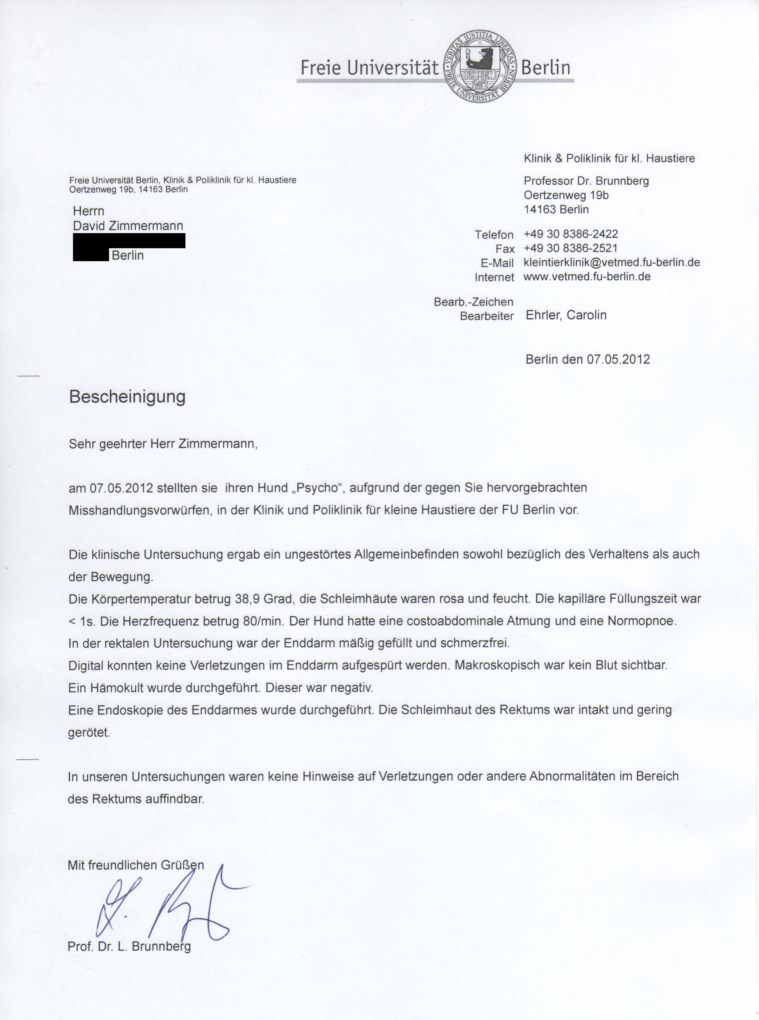 Da ich Eure Zweifel über die Glaubwürdigkeit meiner Aussagen kenne, habe ich ein Gutachten erstellen lassen. Ich war am 07.Mai mit meinen beiden Hunden in der Tierklinik der Freien Universität Berlin und habe mein Döggchen untersuchen lassen, ob es Hinweise auf die mir vorgeworfenen Misshandlungen gibt. Diese Untersuchung hat der leitende Universitätsprofessor durchgeführt und es „waren keine Hinweise auf Verletzungen oder andere Abnormalitäten im Bereich des Rektums auffindbar“. Auch weitere Untersuchungen und Tests bestätigten die gute Gesundheit meines Döggchens. Was hoffentlich jetzt alle Zweifler zufriedenstellt.